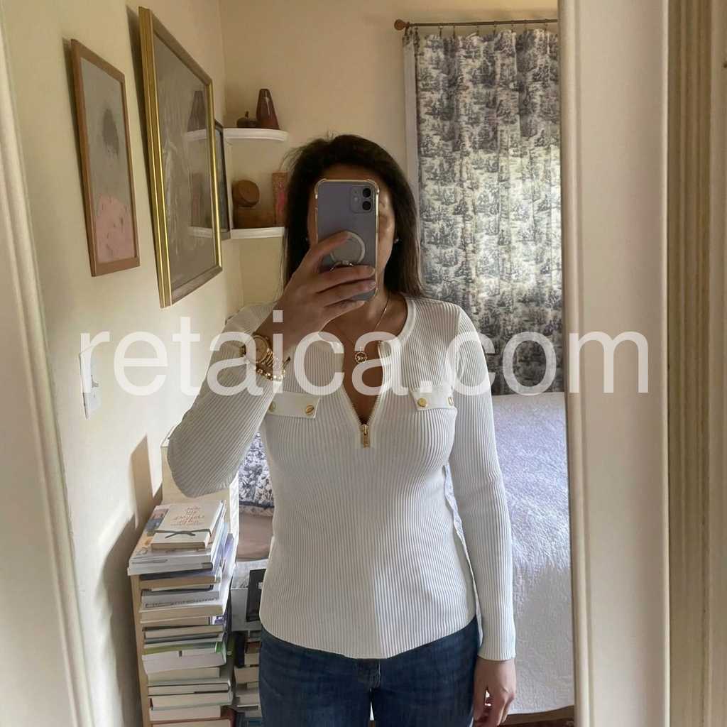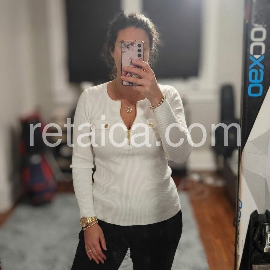 Yes!It runs true to the garment size chart please choose your size based on your measurements.Elevate your wardrobe with our Chic Zip V-Neck White Plain Knit Top. The stylish v-neck neckline and subtle zip feature add a touch of sophistication to any outfit. Made from high-quality, soft knit material, this top is both comfortable and versatile. Perfect for any occasion, elevate your style with this must-have piece.