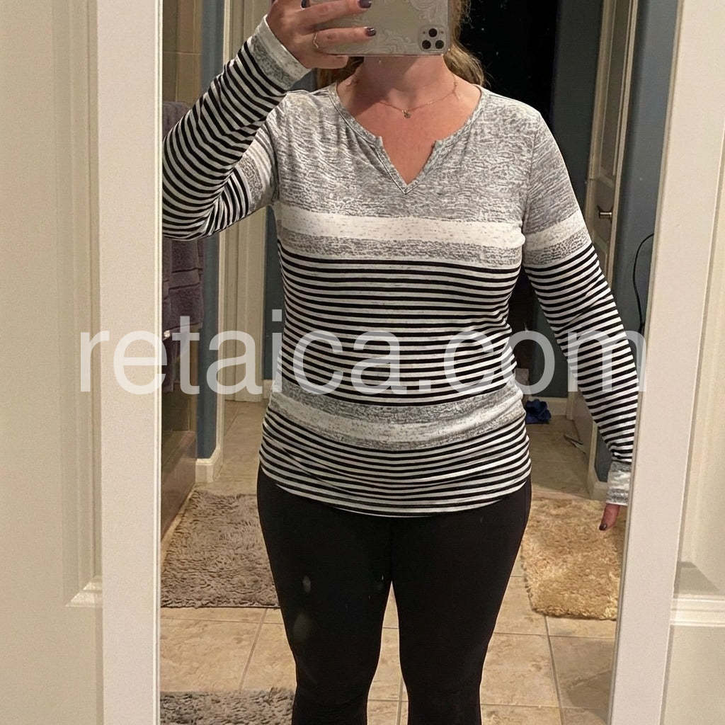 Yes!It runs true to the garment size chart please choose your size based on your measurements.This Youthful Notched Neck Striped Print Long Sleeve Top combines a modern silhouette with timeless style. Designed with a distinctive notched neckline and classic horizontal stripes, it offers a refined yet casual look. The long sleeves provide comfort and versatility, making it a practical choice for layering or standalone wear. Ideal for everyday sophistication, this top complements both relaxed and polished outfits with ease.