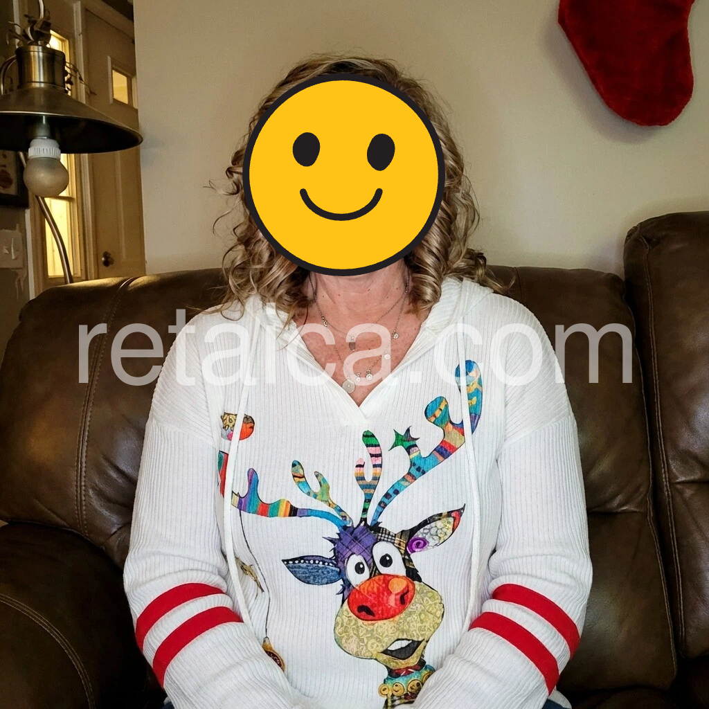 Bring in the winter season with this holiday-ready reindeer top. A white cozy ribbed top with red stripes and colorful reindeer print make this hoodie a cheerful complement to your day or night with its relaxed vibe. A plunging v-neck and buttons on the front give it the perfect amount of detail and chic fit.